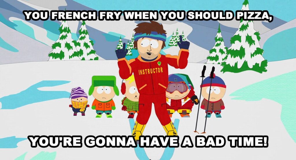 On the other hand, when you sit forward in your skis, you’re the one in control. You are an agent for action. It’s incredibly satisfying to be an agent for action. You don’t do things (good or bad) because other people tell you to do them (boo!). You do things because they are righteous and ultimately bring joy (yay!). Seek the Kingdom of God first, and then all else will be added onto you. I can testify of the reality of the nature of this active vs inactive engagement in Christ. It’s not a fun journey sitting back in skis! I once crashed into a 40 year old woman and got called a danger to society on a blue slope before I learned how to ski🤪🤪 (On another note, if you french fry when you’re supposed to pizza, you’re gonna have a bad time. Thanks South Park.)